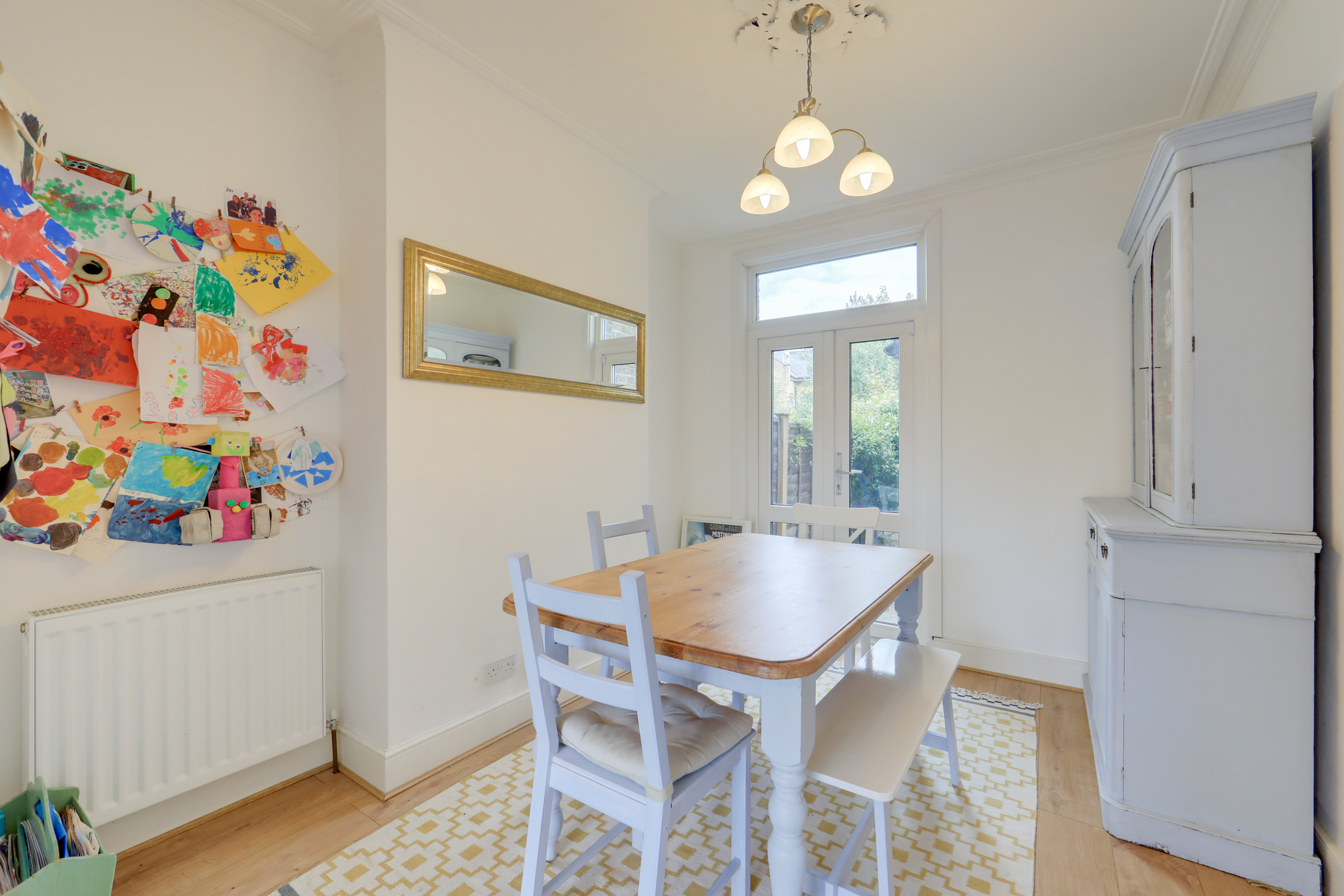 Pendant light, double-glazed window/door leading to the garden, radiator, wood floor.