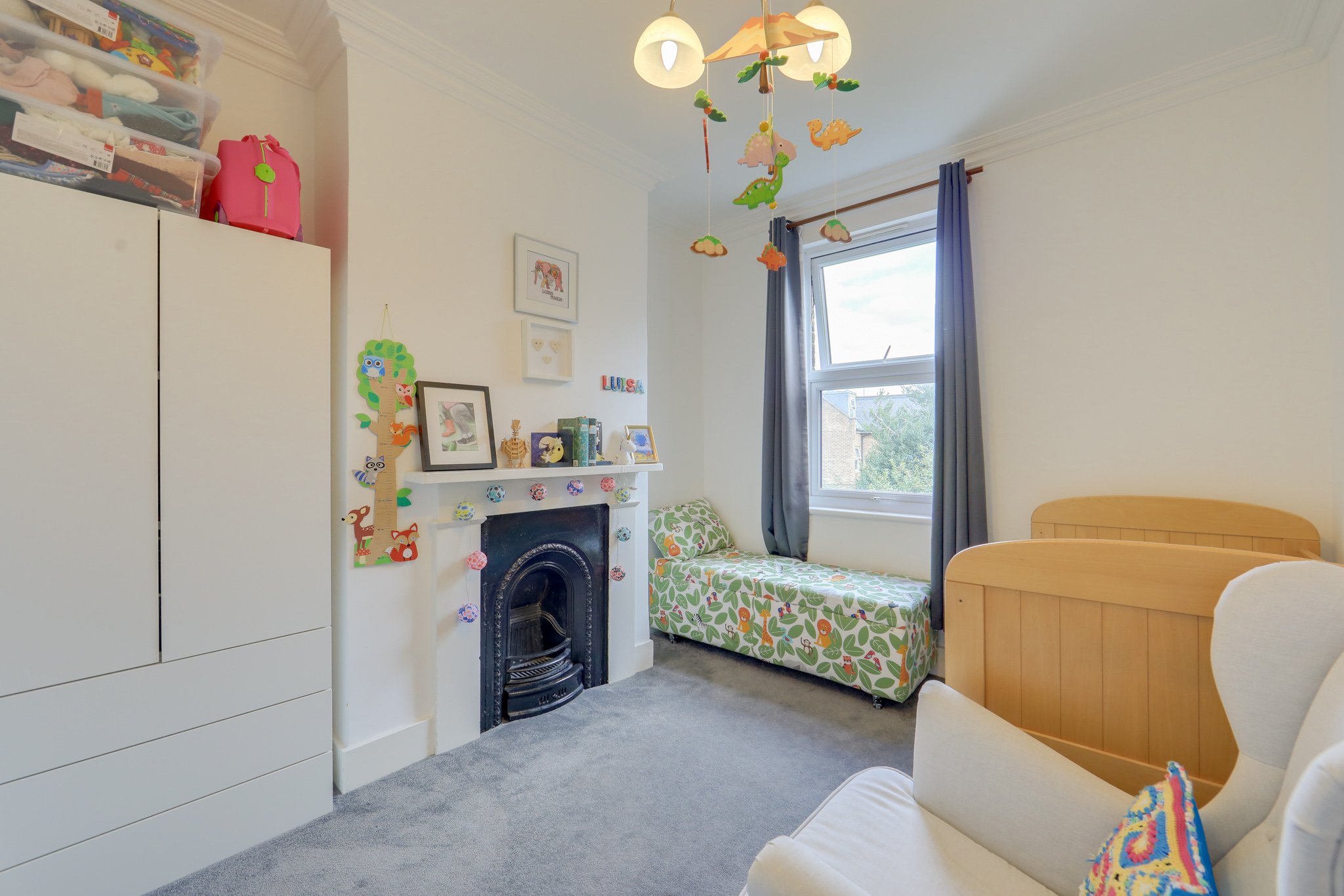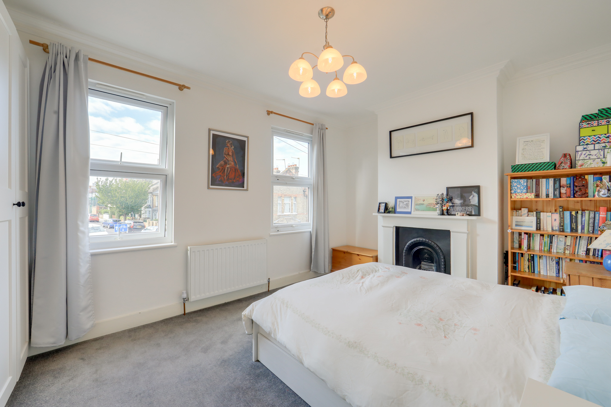 Pendant light, double-glazed windows, radiator, fireplace, alcove space, fitted wardrobes, carpet.