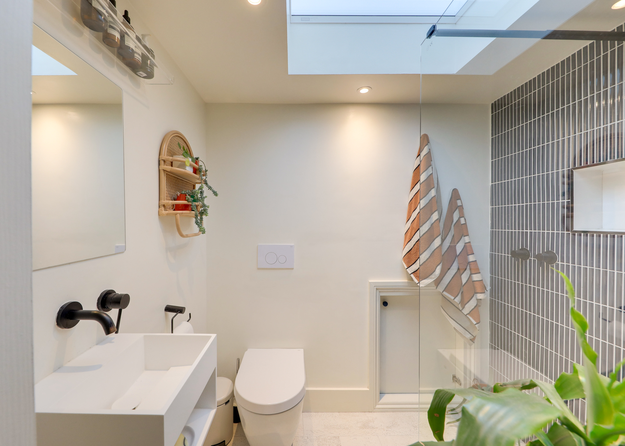 Skylight, inset ceiling spotlights, walk-in shower, washbasin, WC, cork flooring.