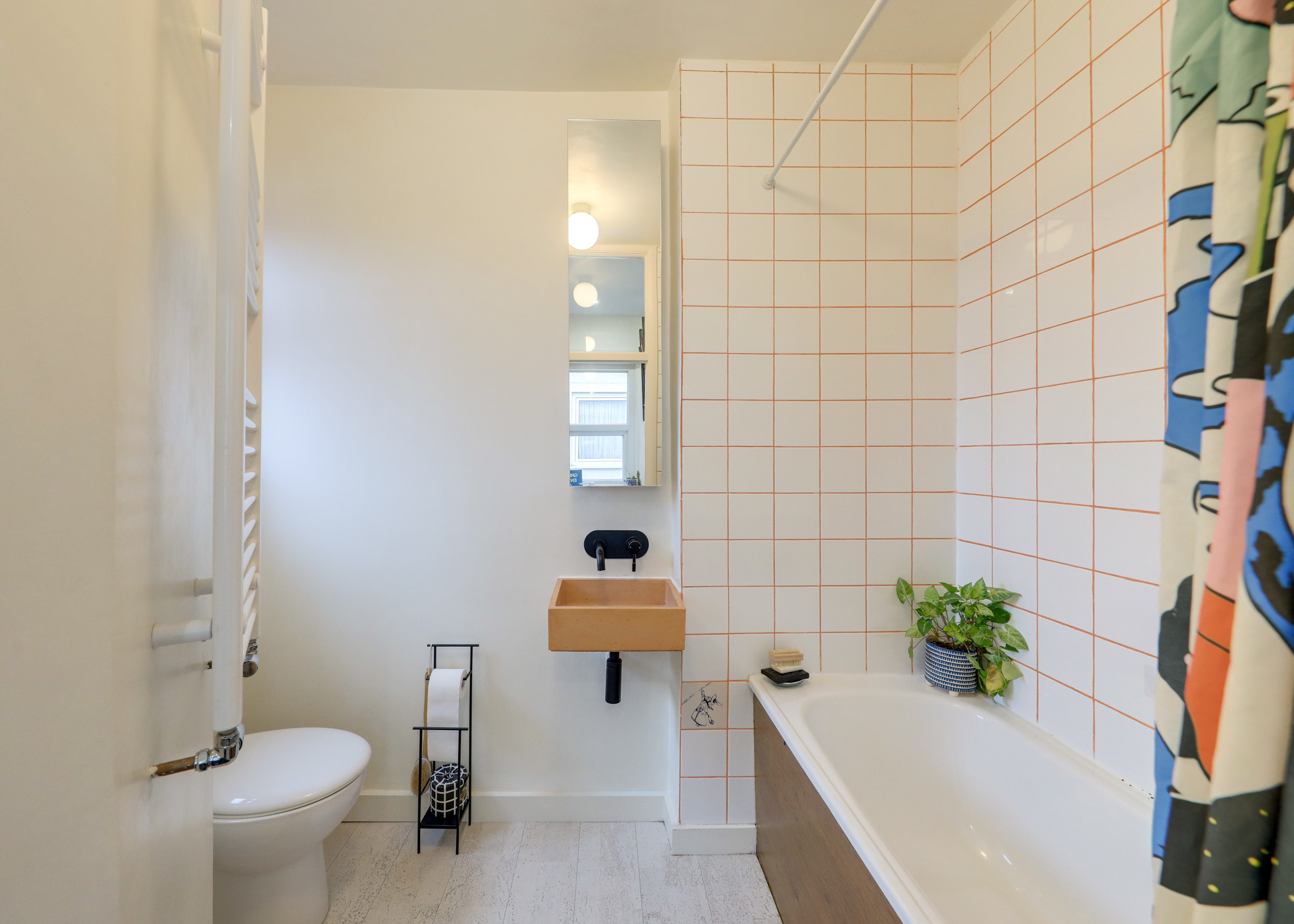 Double-glazed window, ceiling light, bathtub with shower, washbasin, WC, heated towel rail, cork flooring.