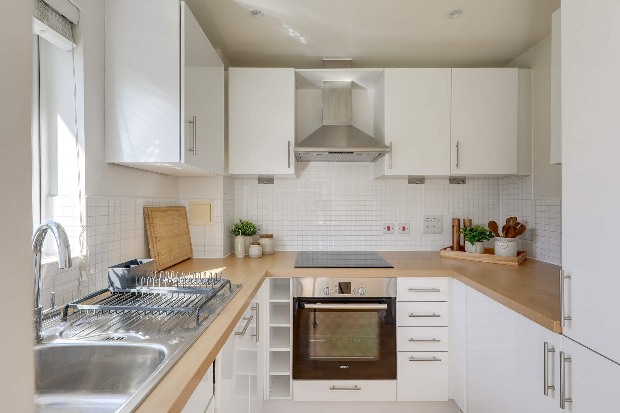 Spotlights, window, half tiled walls, matching base and wall units, integrated fridge/freezer, induction hob with extractor hood, oven, stainless sink with mixer tap, integrated dishwasher, tiled floor.