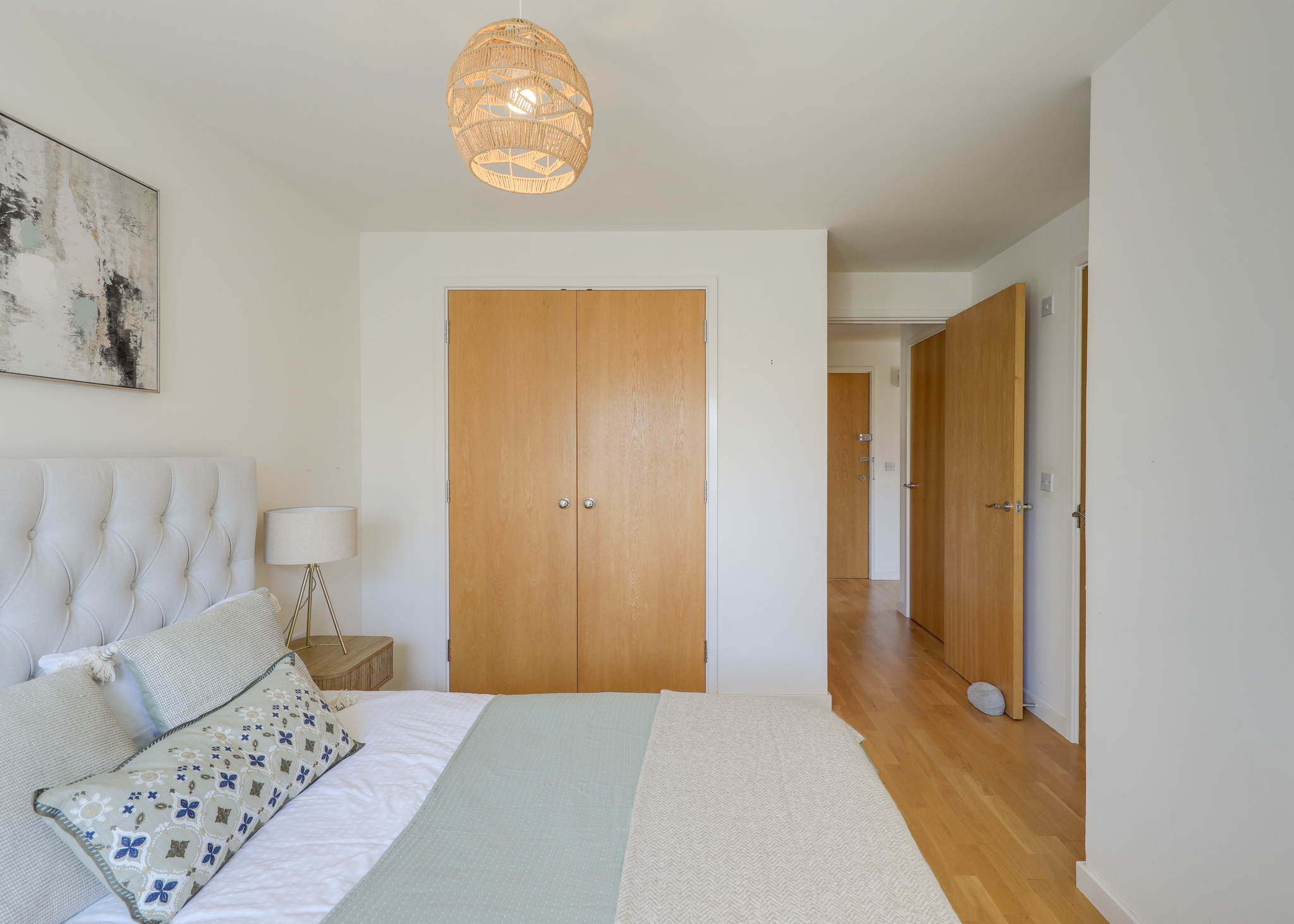 Pendant light, window, radiator, built-in wardrobe, wood floor, en-suite shower room.