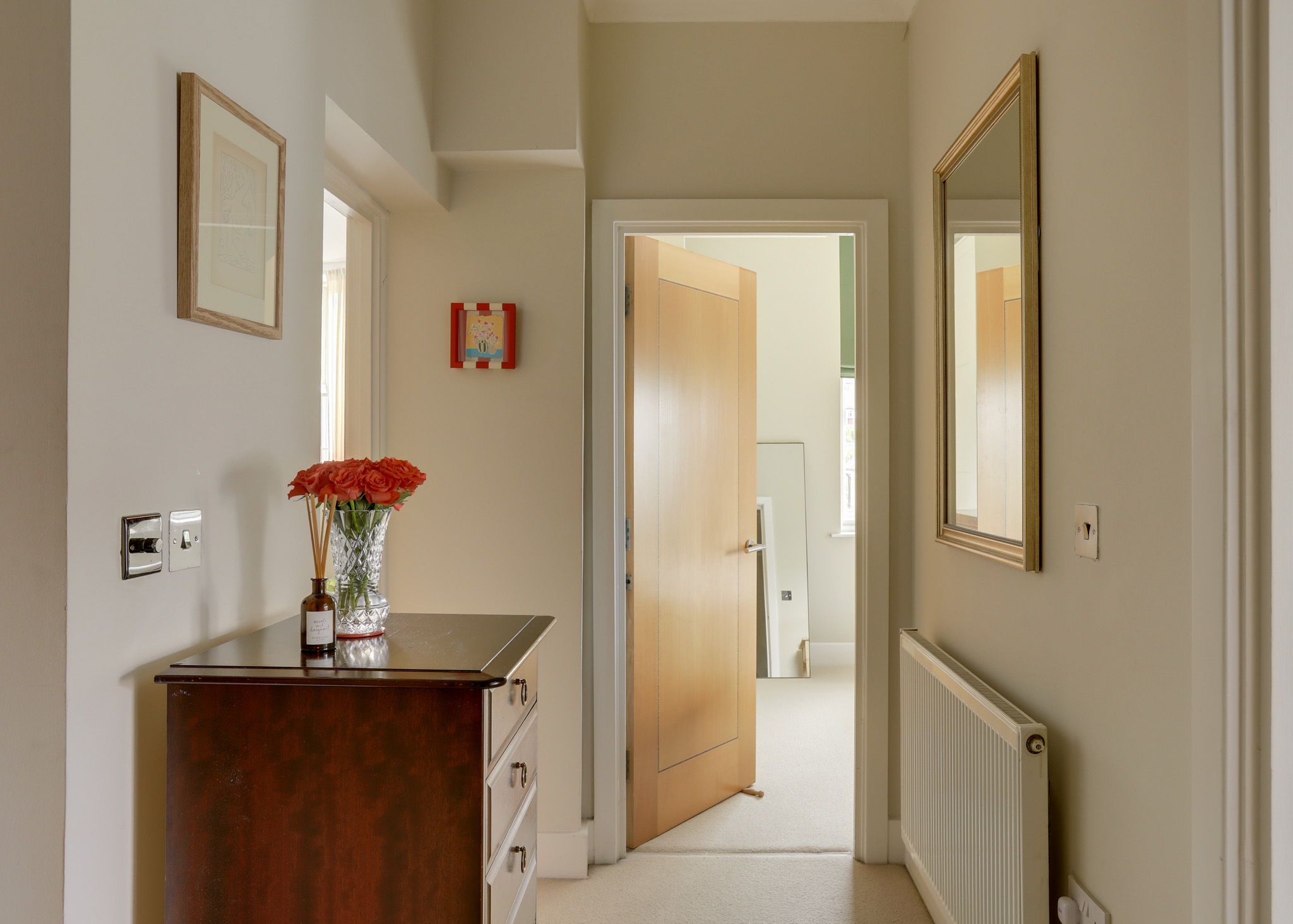 Pendant ceiling light, radiator, fitted carpet.