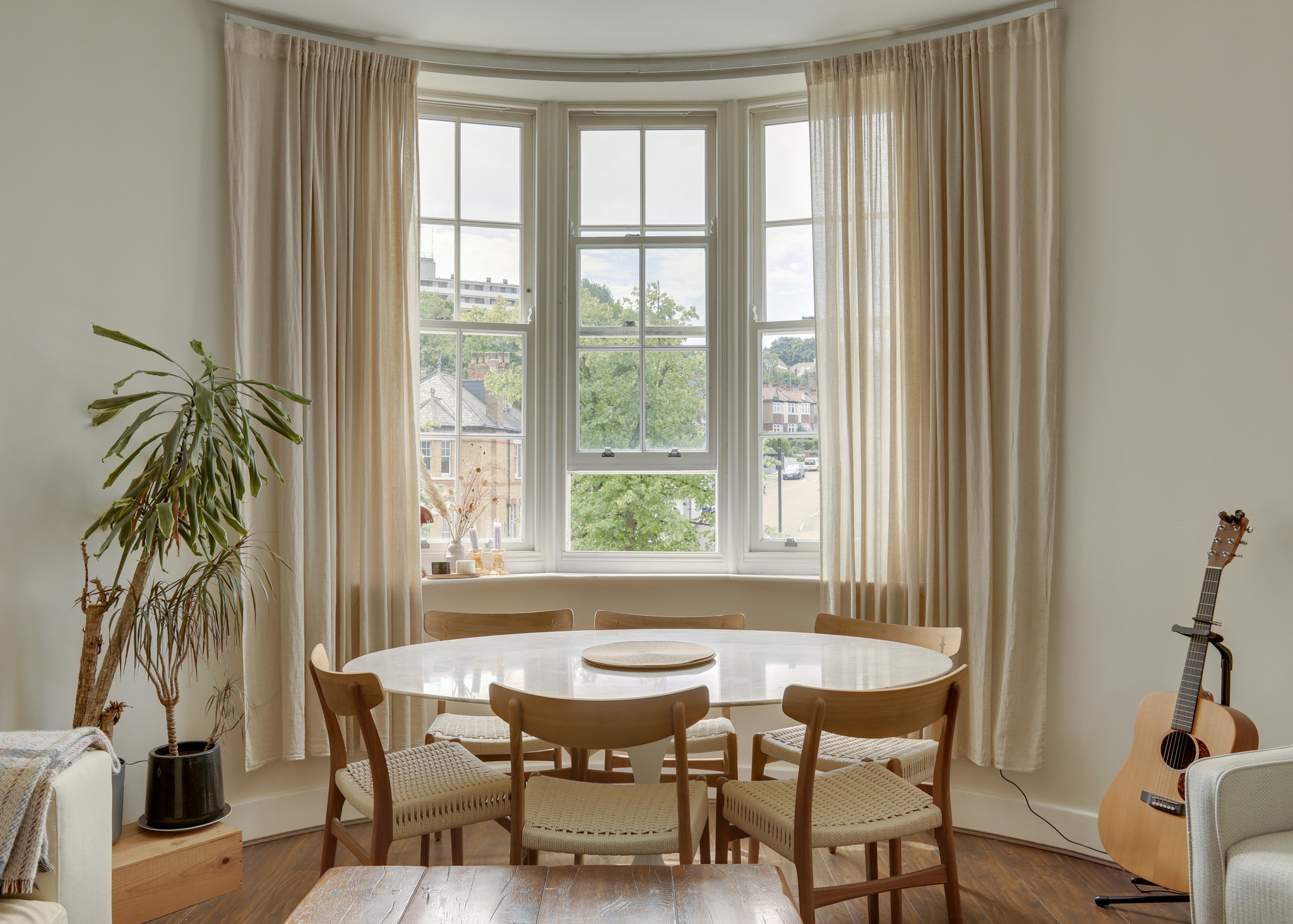 Stepping inside, the welcoming entrance hall opens into a generous open-plan living space, featuring elegant sash bay windows, high ceilings, and ample room for both dining and relaxing. The contemporary kitchen is sleek and well-designed, complementing the room’s bright and airy feel. Both bedrooms are spacious doubles, while the modern bathroom offers a calm and stylish retreat.