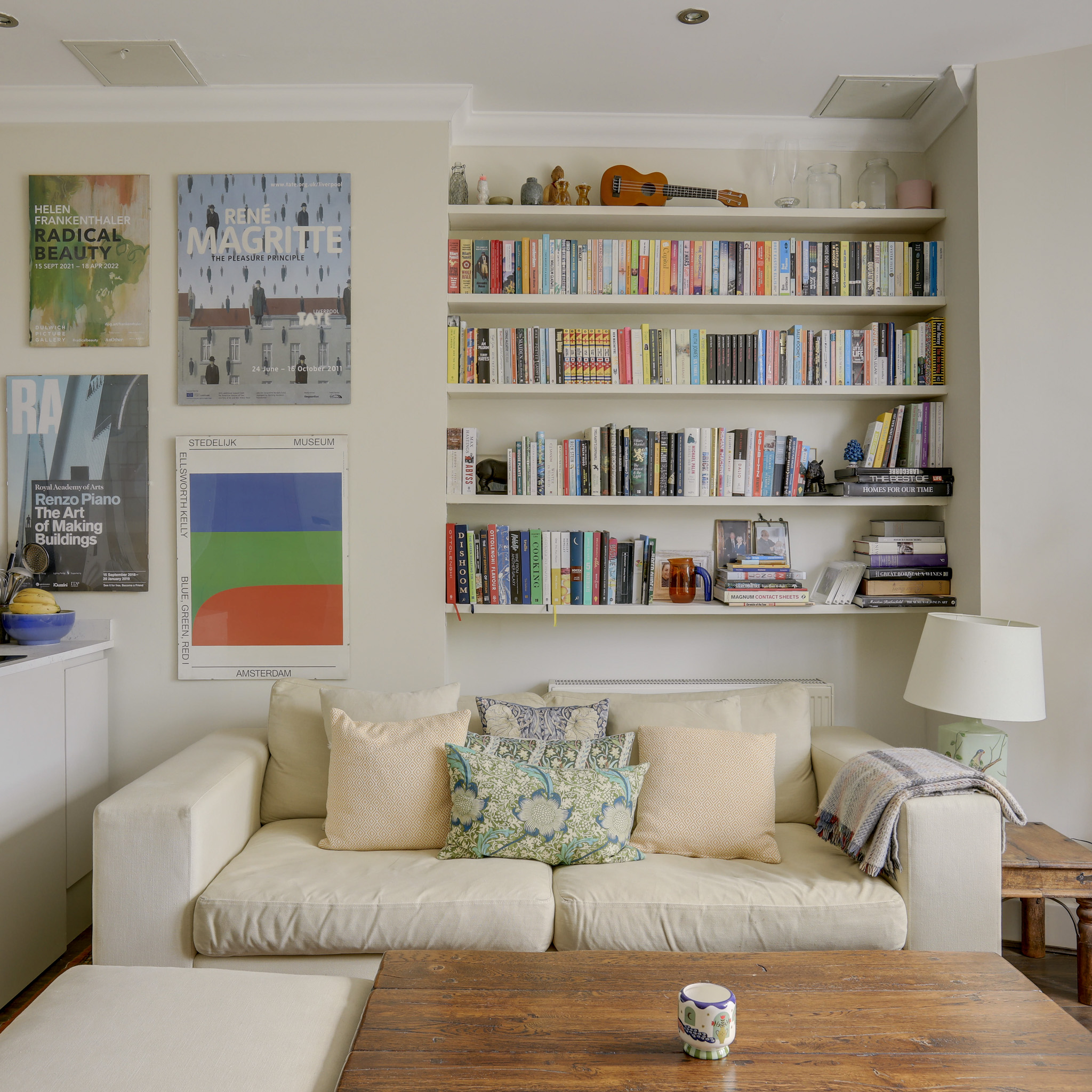 Double-glazed sash bay windows, inset ceiling spotlights, alcove shelving, radiator, wood flooring.
