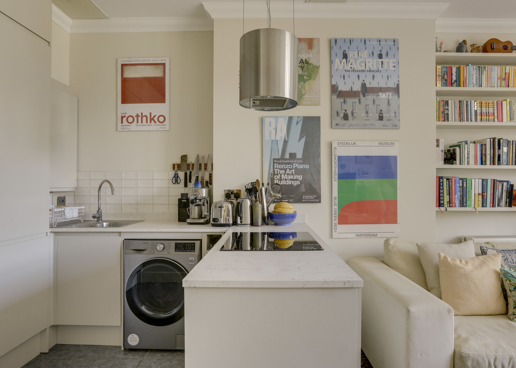 Inset ceiling spotlights, fitted kitchen units, sink with mixer tap and drainer, integrated dishwasher, fridge/freezer, oven, microwave and hob, extractor hood, plumbing for washing machine, tile flooring.