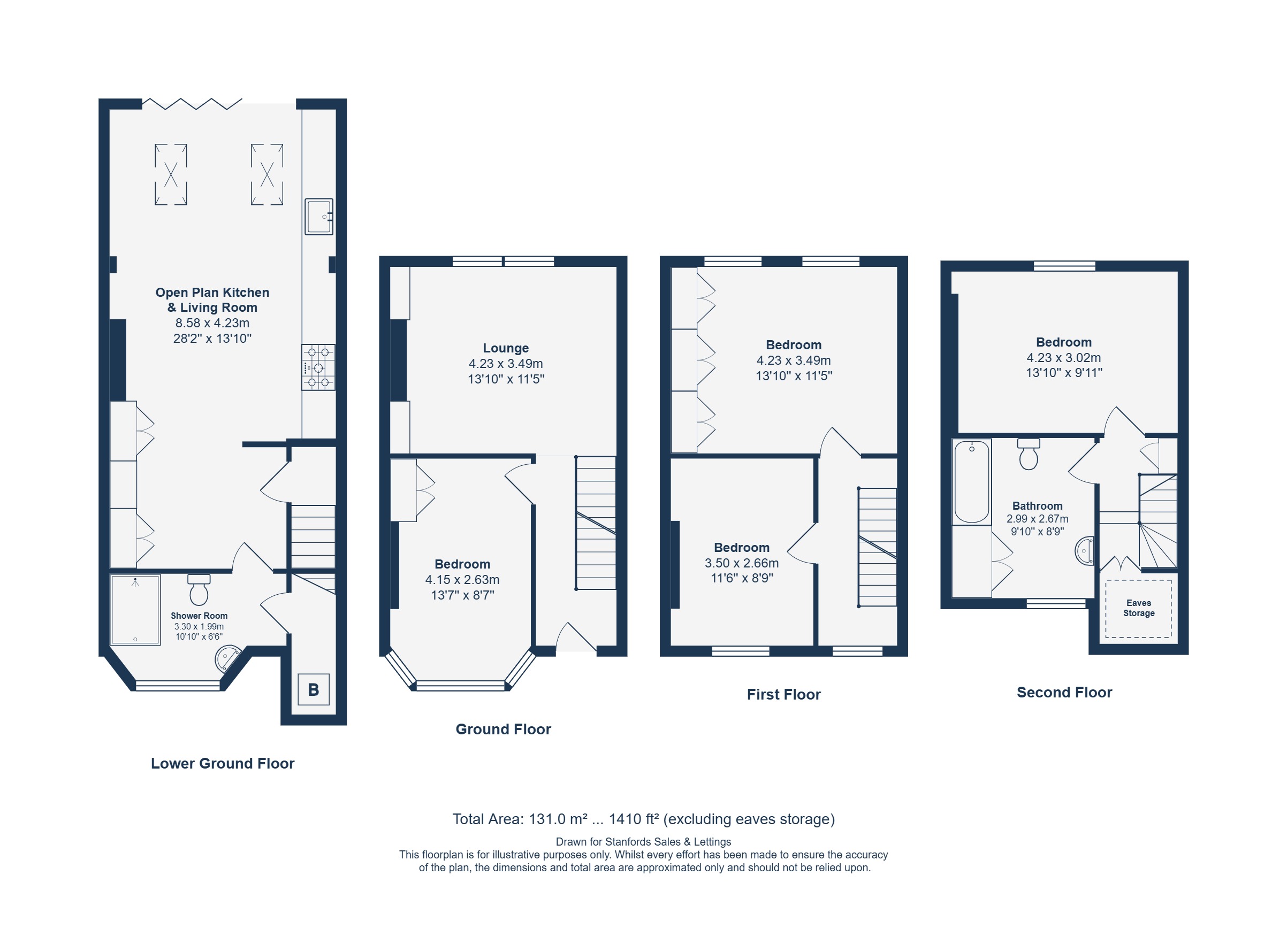 The first floor offers two further bedrooms, both well-proportioned and full of natural light, while the second floor features a spacious bedroom, a family bathroom, and useful storage.