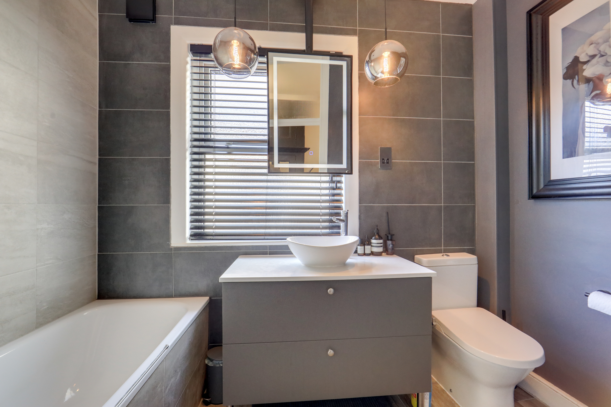 Pendant lights, window, vanity unit with sink basin and mixer tap, toilet, bathtub, underfloor heating, tile floor.
