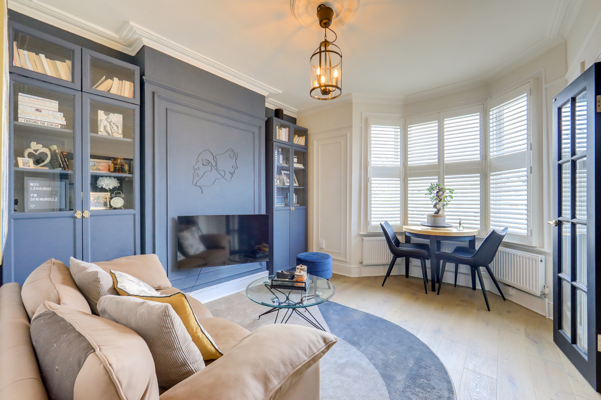 Pendant light, bay window, radiator, built in shelving units, wood floor.