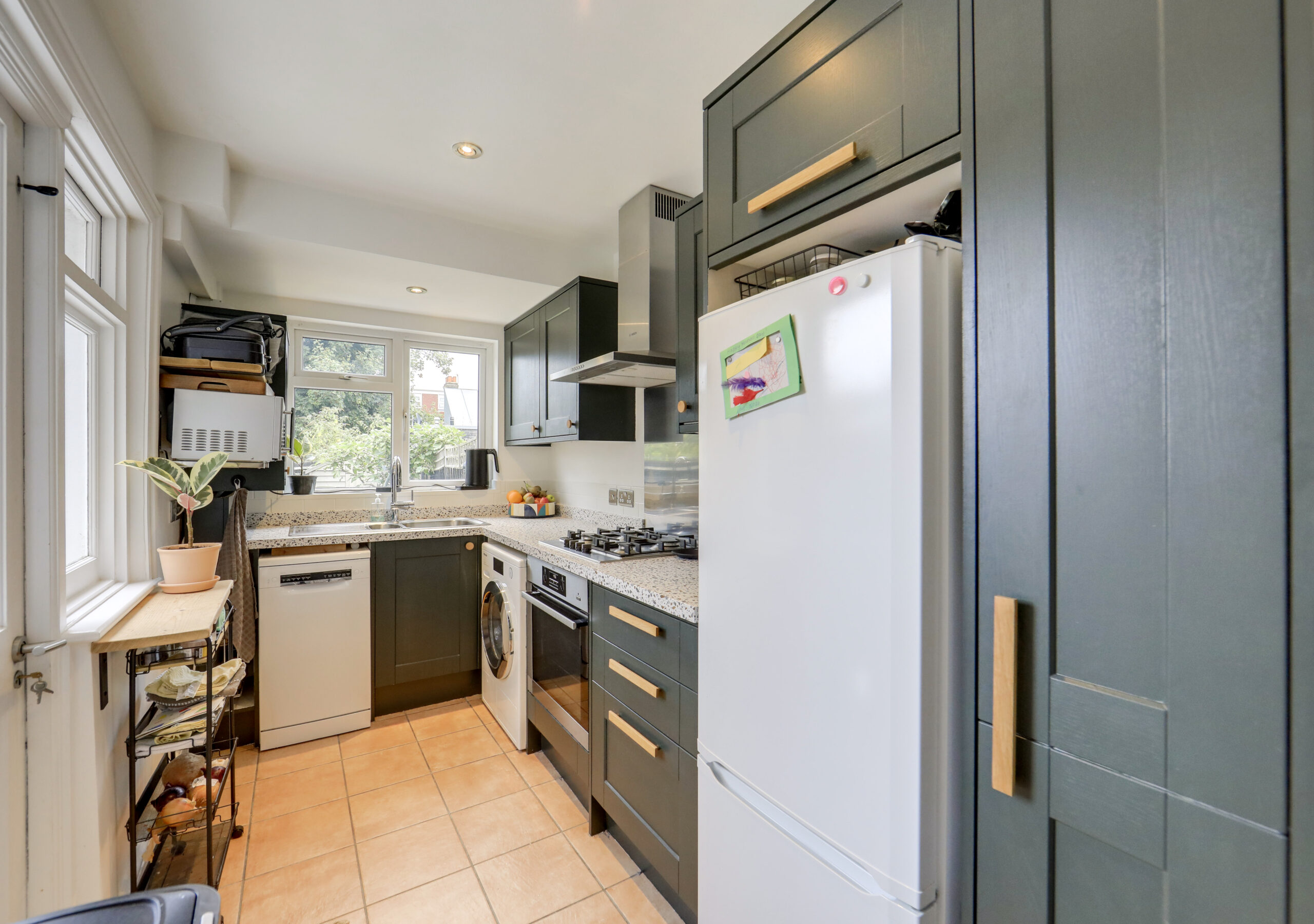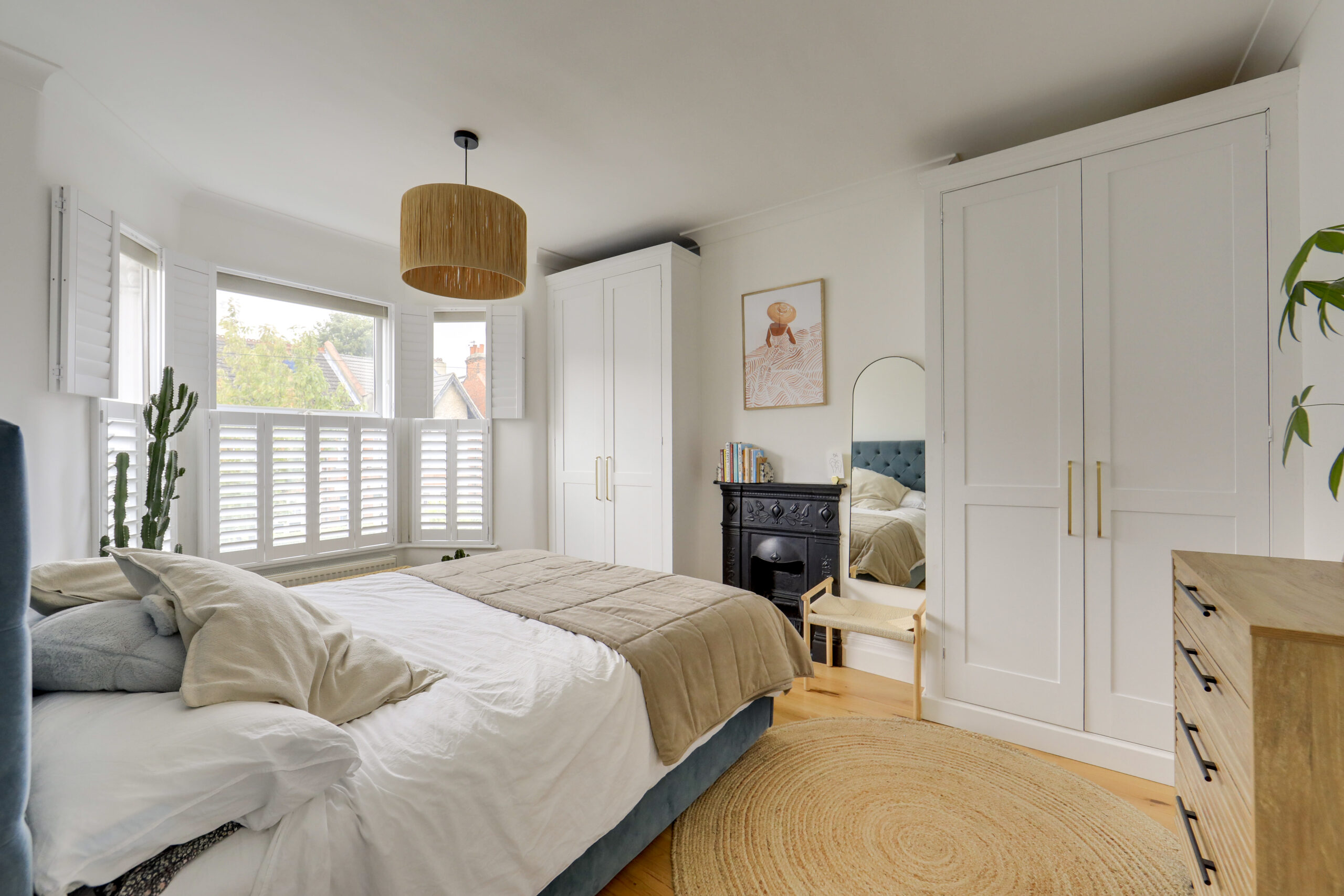 The modern kitchen is equipped with sleek units in a stylish finish, integrated appliances including an oven, washing machine, and gas hob, and abundant natural light from wide windows. Direct garden access from the kitchen creates seamless indoor-outdoor living, perfect for family life and entertaining. Upstairs, the principal bedroom offers large windows with shutters, built-in wardrobes for ample storage, and a decorative fireplace, all set against a calming neutral palette and wooden flooring. Additional bedrooms include a versatile children’s room with built-in storage and a cosy office space featuring bespoke shelving, natural light, and hardwood floors - ideal for home working or study. The contemporary bathroom is finished with neutral tiling and features a walk-in shower with a glass screen, a large mirror, and a heated towel rail for added comfort.