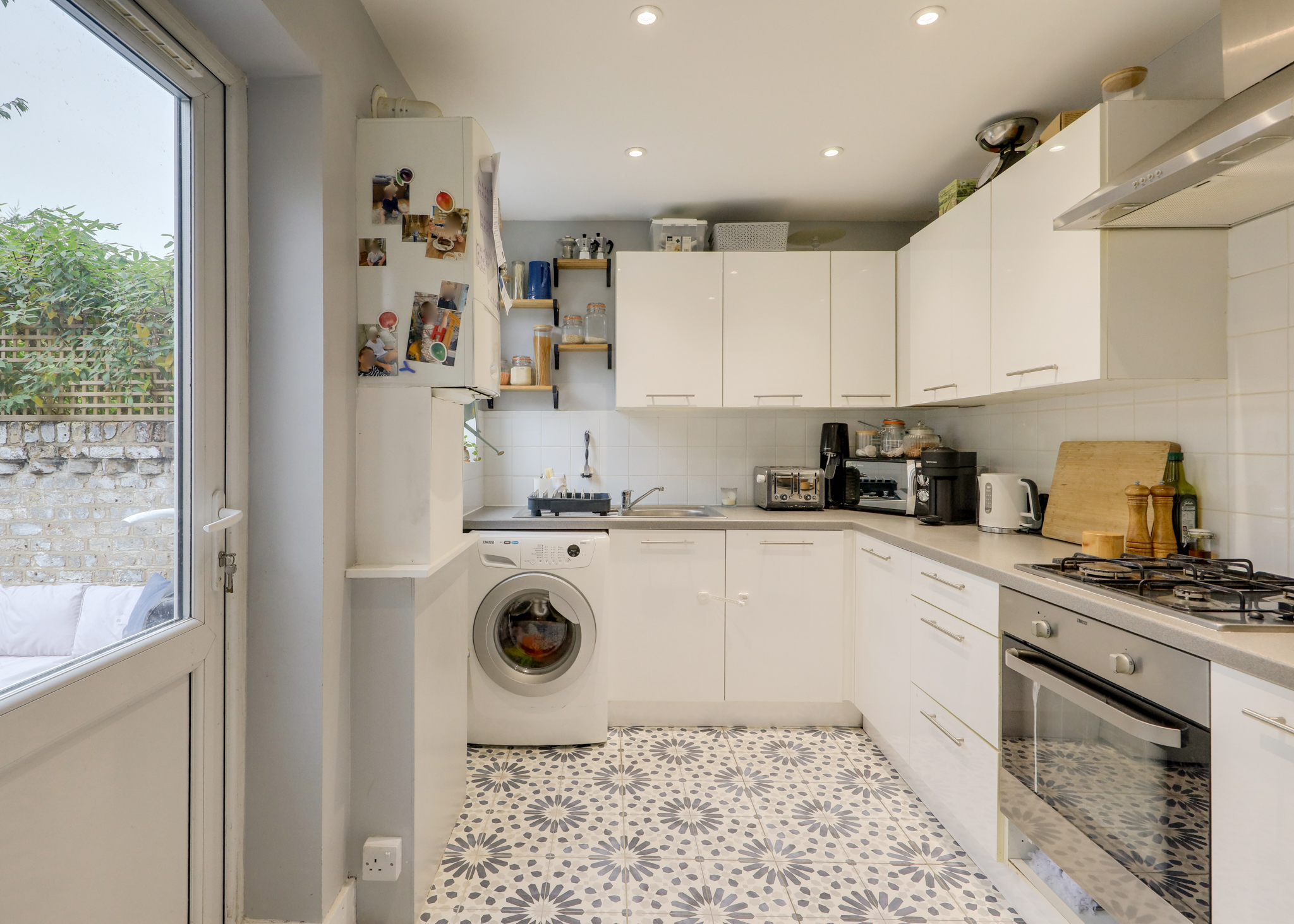 Double-glazed window and door to garden, inset ceiling spotlights, fitted kitchen units, sink with mixer tap and drainer, integrated oven and gas hob, extractor hood, plumbing for washing machine, tile flooring.