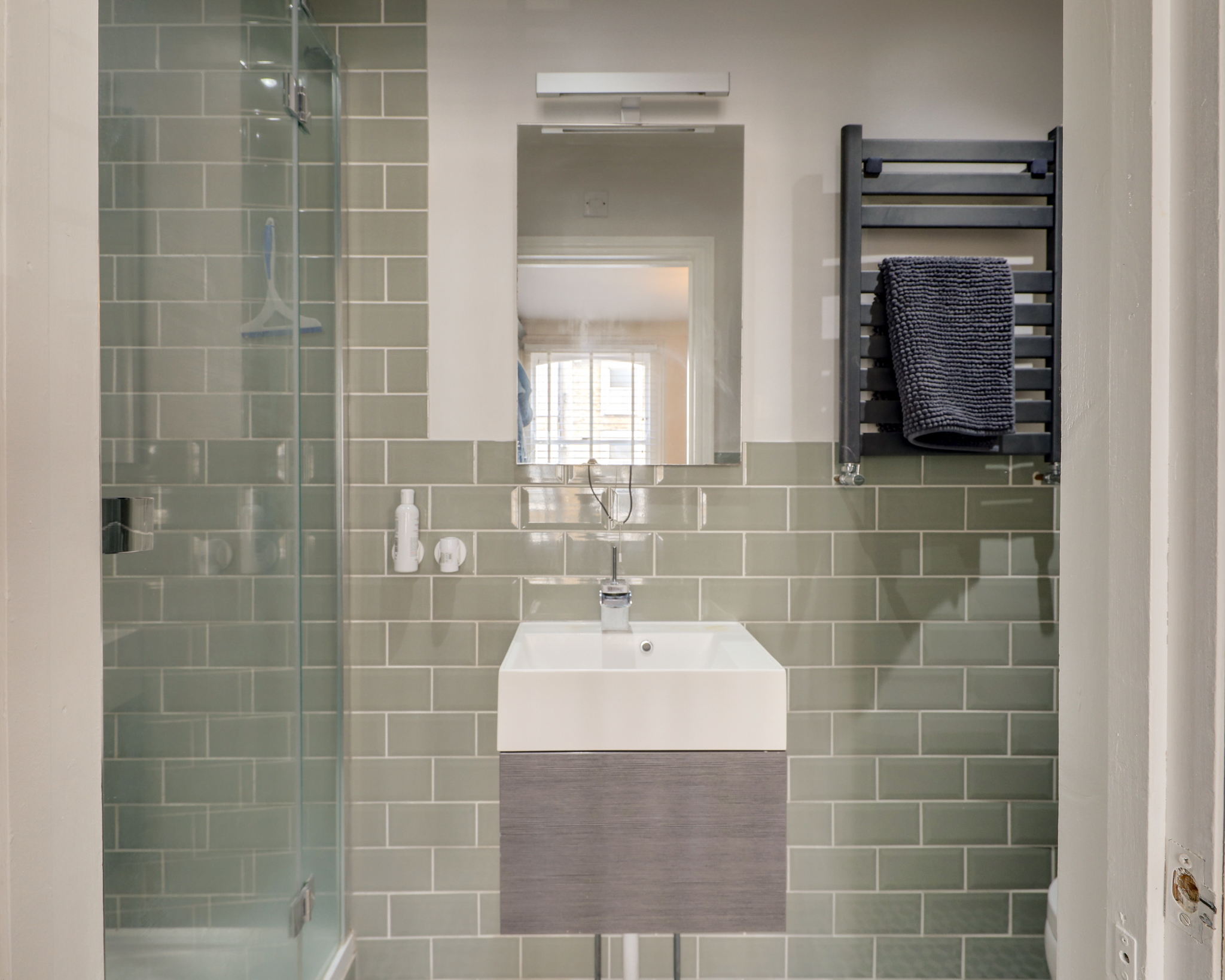 Inset ceiling spotlights, walk-in shower, washbasin, WC, heated towel rail, tile flooring.