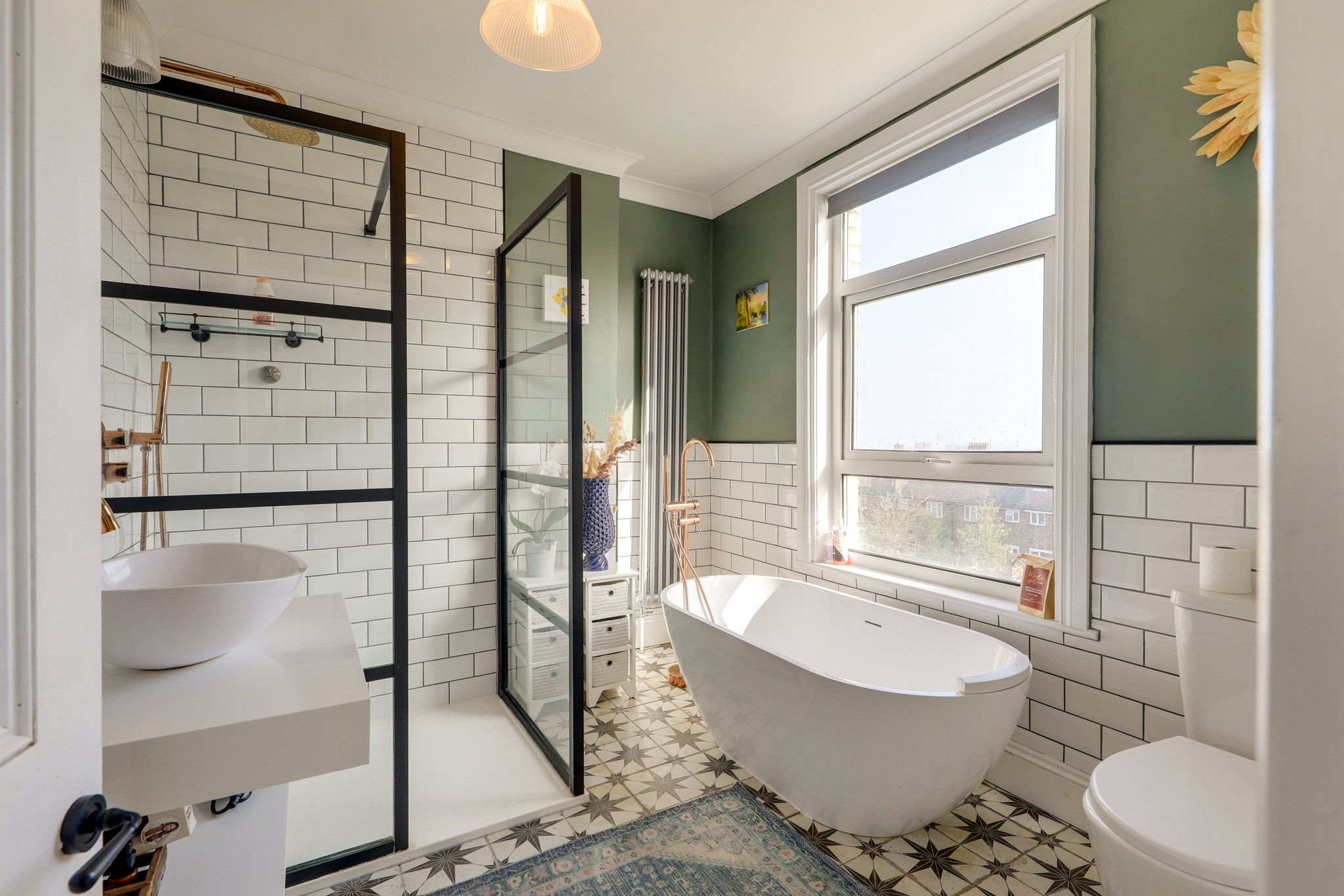 Double-glazed window, pendant ceiling light, freestanding bathtub, walk-in shower, washbasin, WC, column radiator, tile flooring.