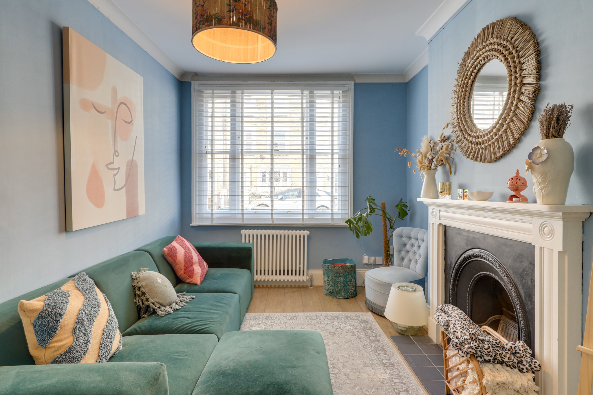 Sash windows, pendant ceiling light, fireplace, column radiator, wood flooring.