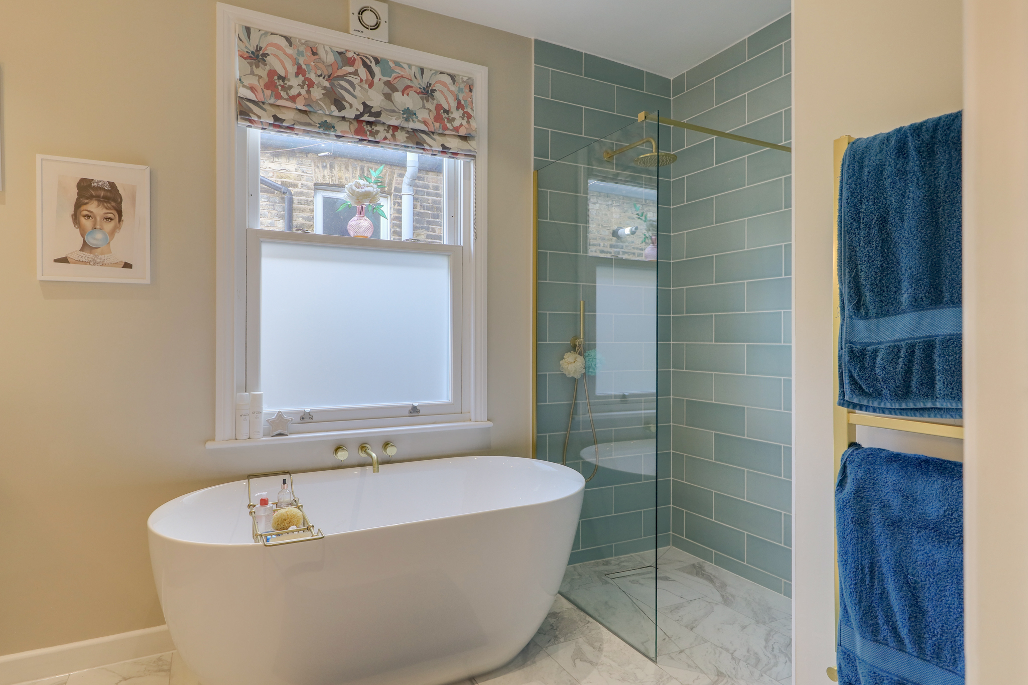 Spotlights, double-glazed sash window, wall-mounted towel radiator, walk-in shower with tiled walls, brass wall mounted shower head with matching hand-held showerhead an taps, freestanding bath tub with wall-mounted brass mixer taps, hidden cistern white toilet with tiled half wall, vanity unit with double sink, mixer taps, wall mounted lights, vinyl marble finish floor, underfloor heating.