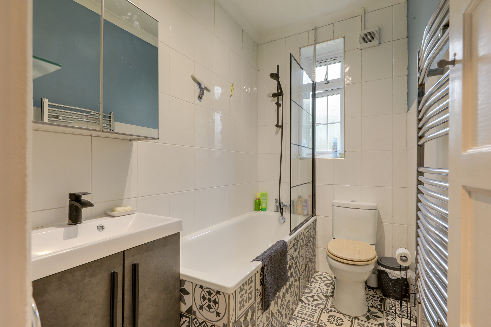 Double-glazed window, tiled surround, tiled floor, panel-enclosed bath with shower, low-level WC, fixed wash basin with vanity unit, powered extractor fan, heated towel rail.