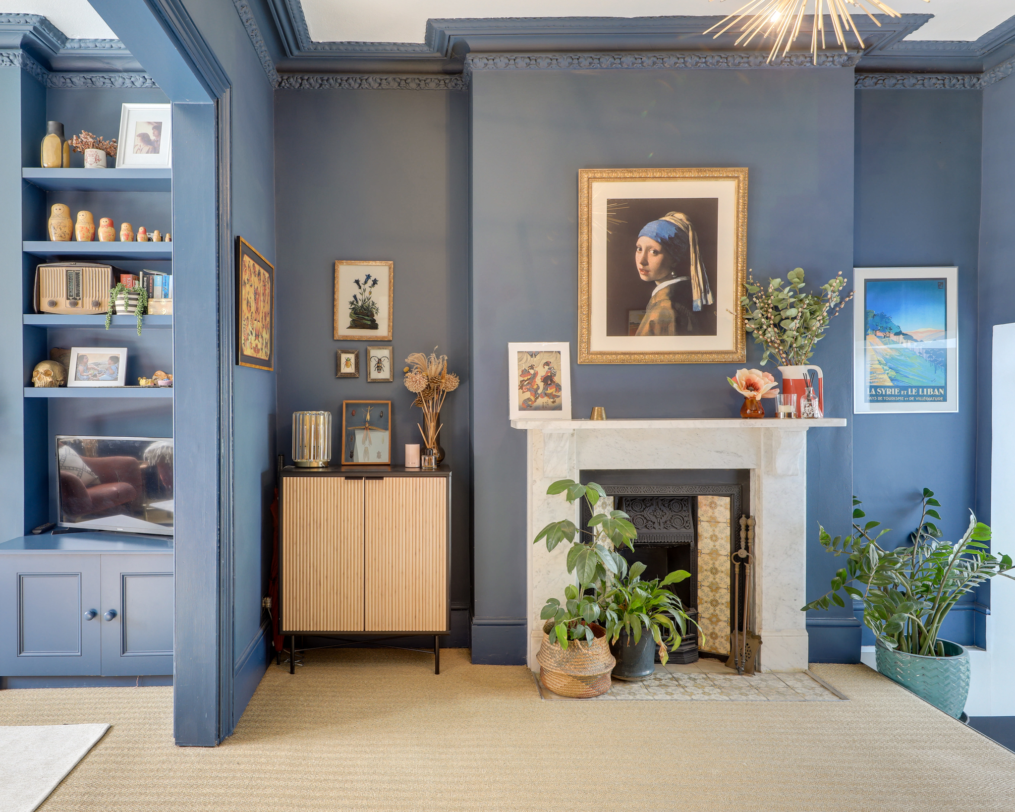 Pendant ceiling light, fireplace, radiator, fitted carpet.