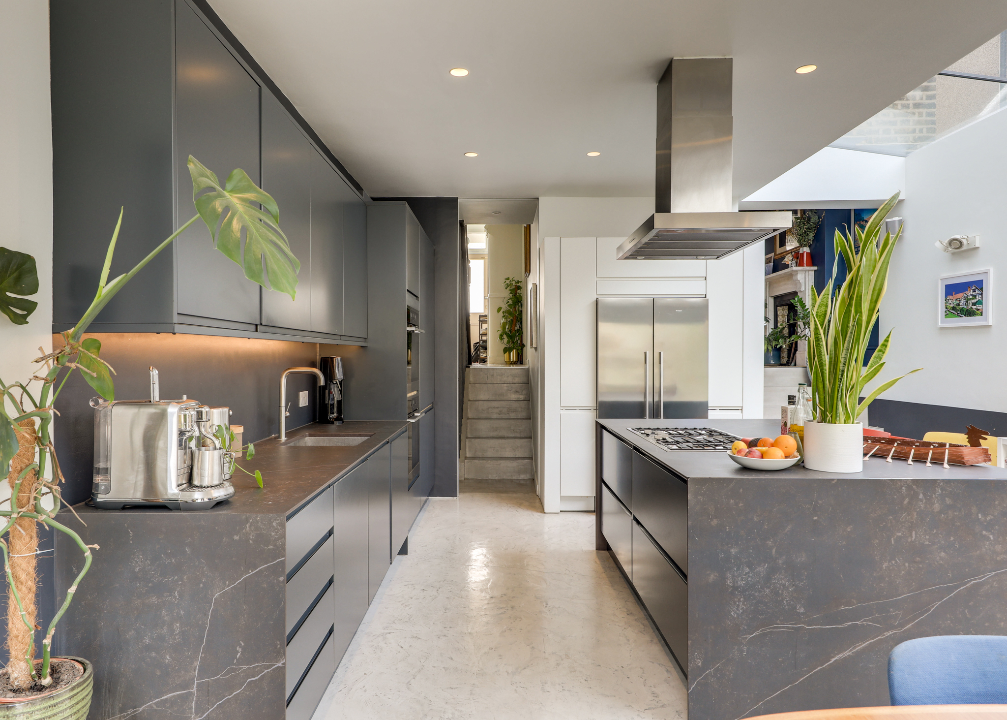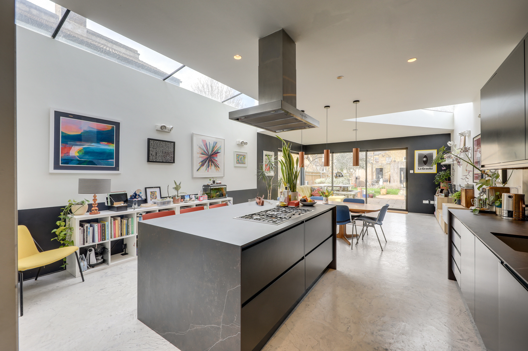 Double-glazed sliding doors to garden, skylights, inset ceiling spotlights, pendant ceiling light, wall-mounted lights, fitted kitchen units, sink with mixer tap, integrated dishwasher, fridge/freezer, wine cooler, Miele ovens, gas hob, extractor hood, underfloor heating.