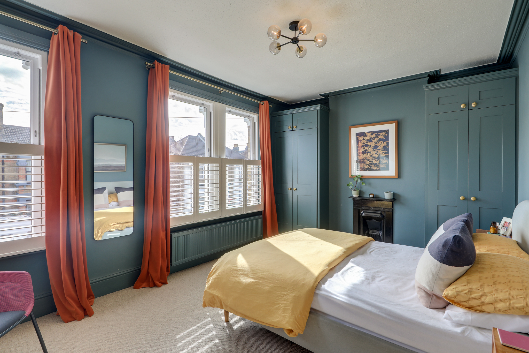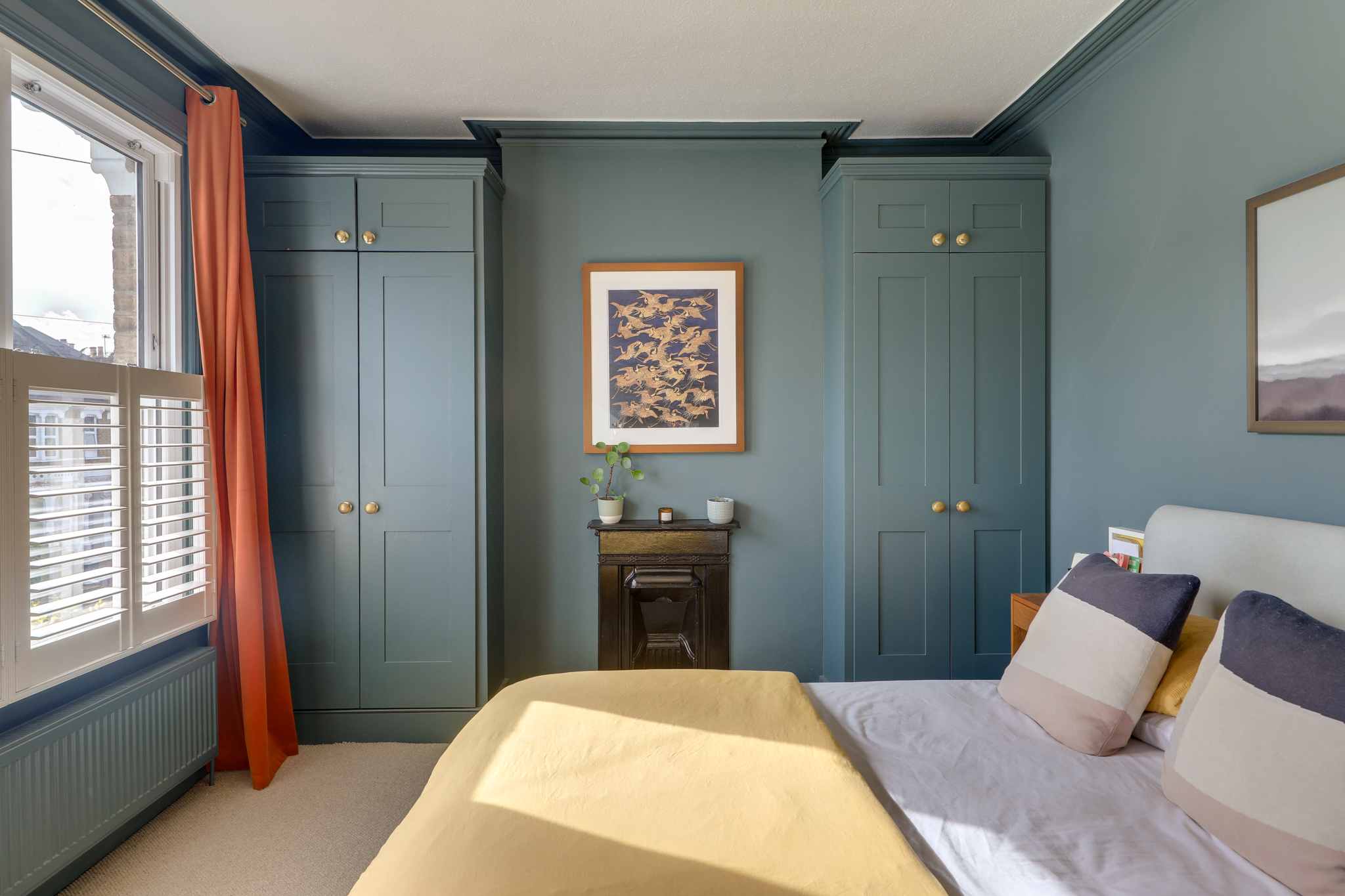Double-glazed sash bay windows, wooden shutters, pendant ceiling light, alcove shelving and cabinet, radiator, fitted carpet.