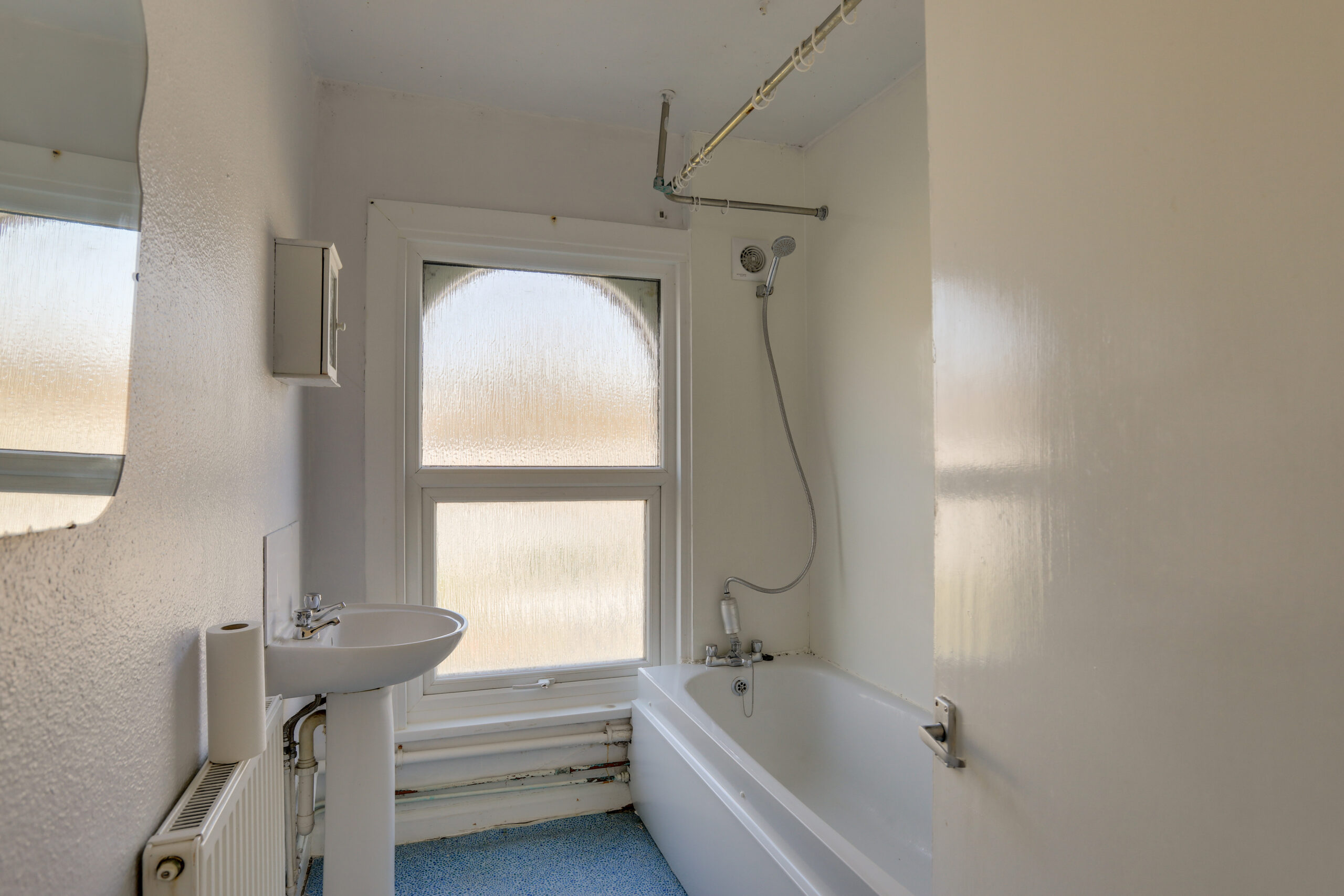 Window to the front, panel enclosed bath with shower attachment, fixed wash basin, low-level WC.