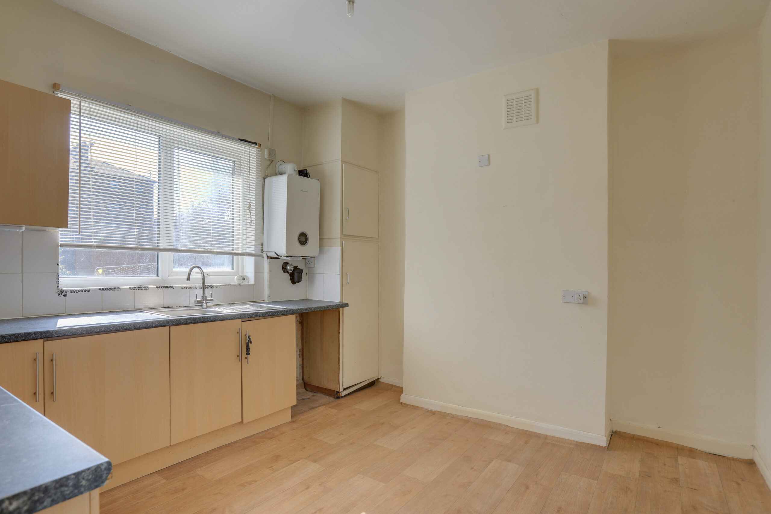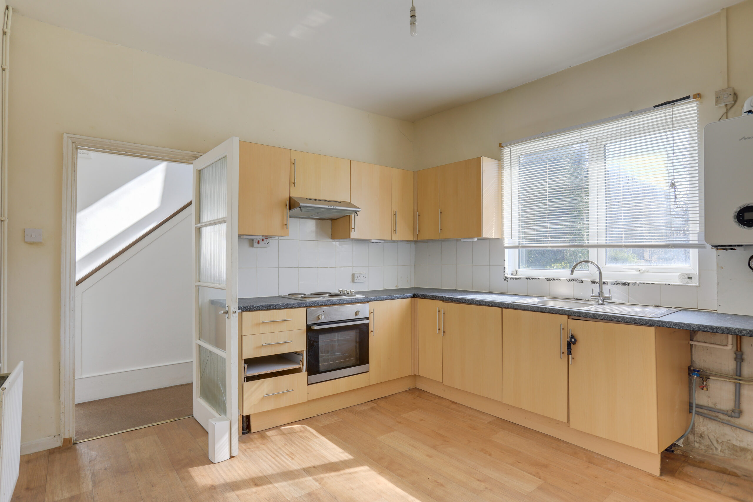 Window to the rear, wood effect flooring, kitchen units with plumbing for a sink, boiler, hob, electric oven, space and plumbing for washing machine/dishwasher.
