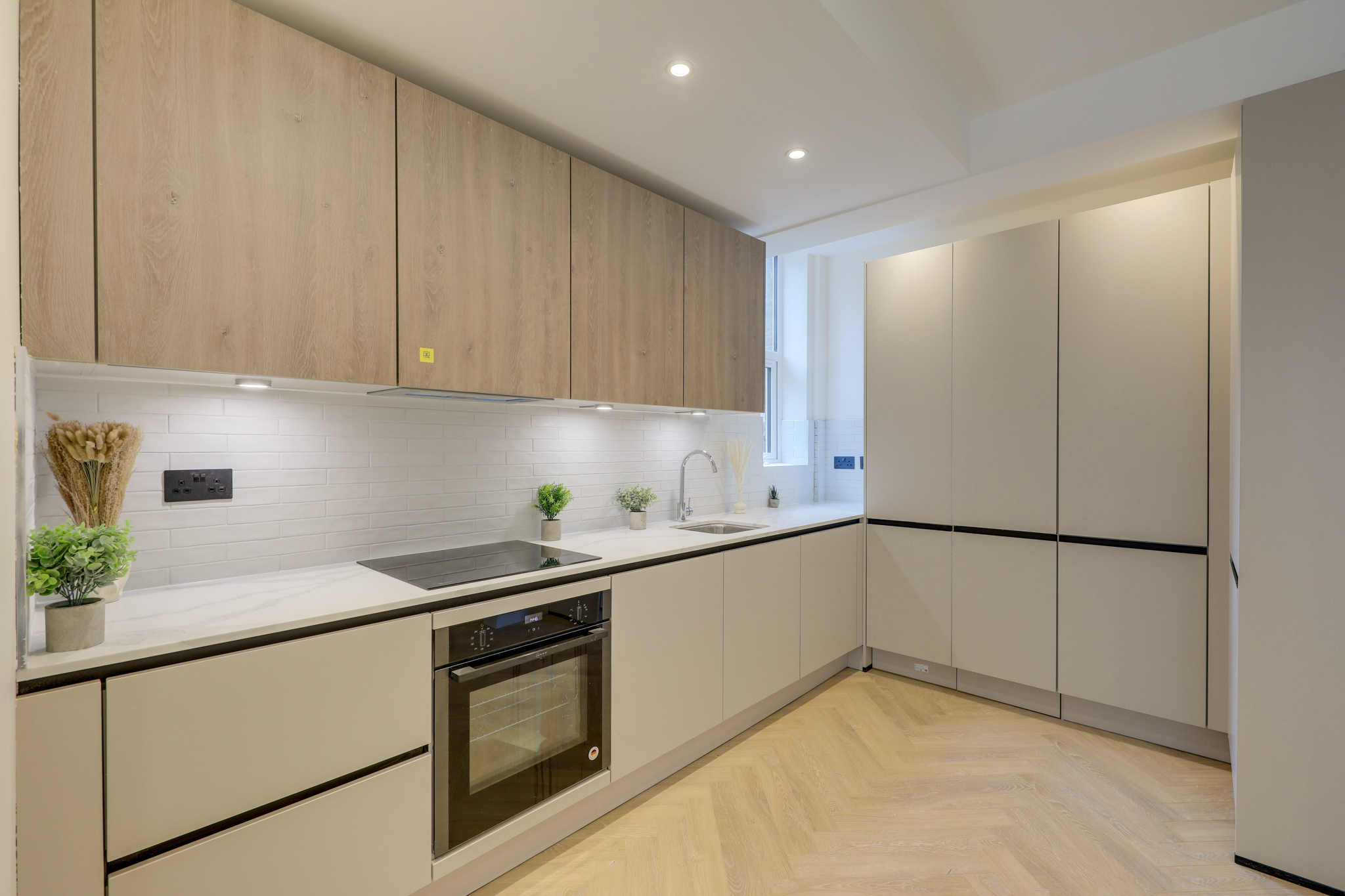 Spotlights, window, radiators, sleek cabinets, oven and hob, hidden fridge/freezer, sink with mixer tap, wood floor.