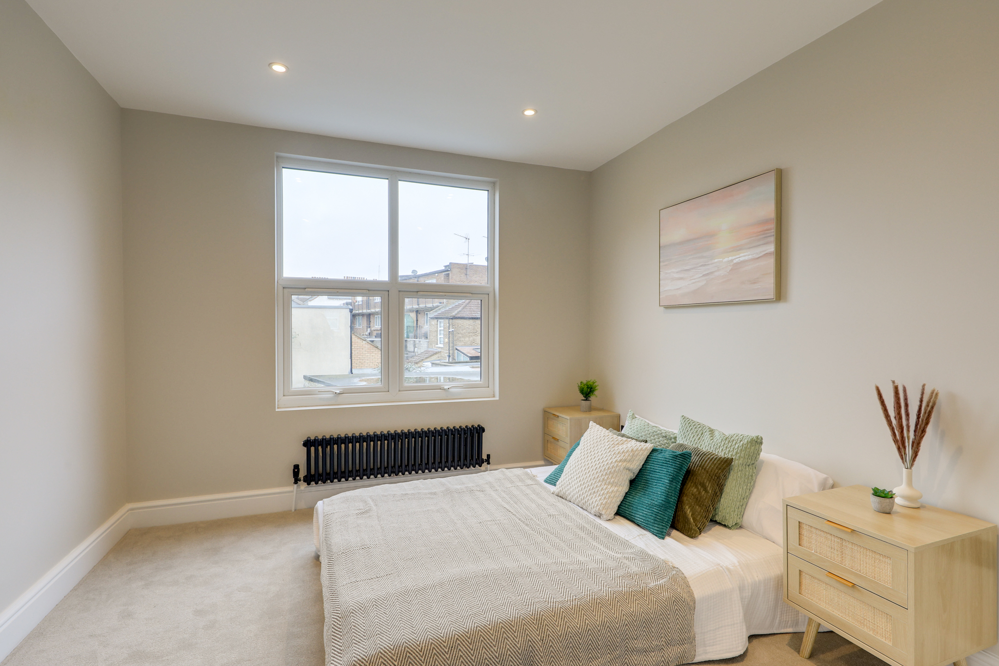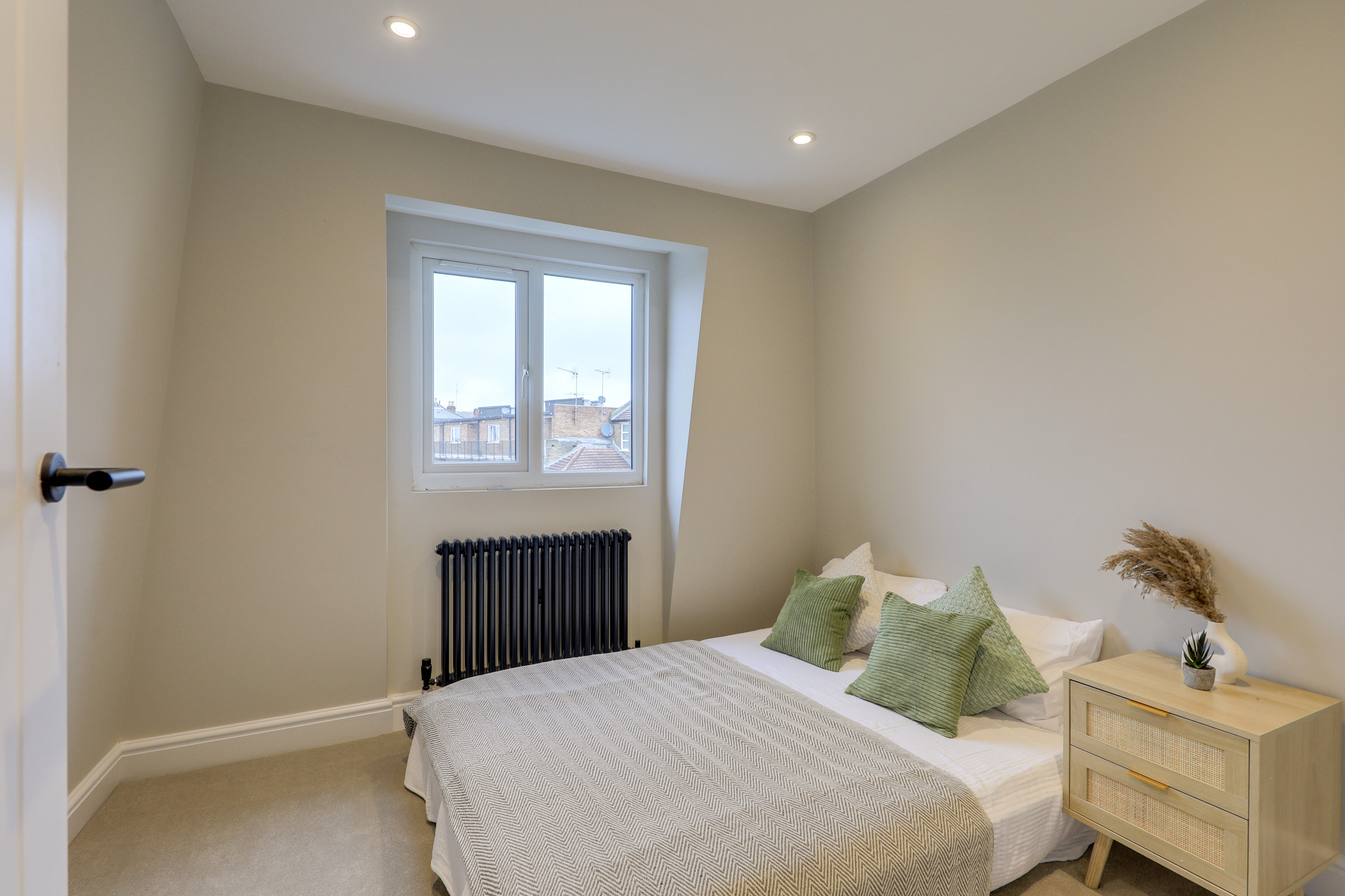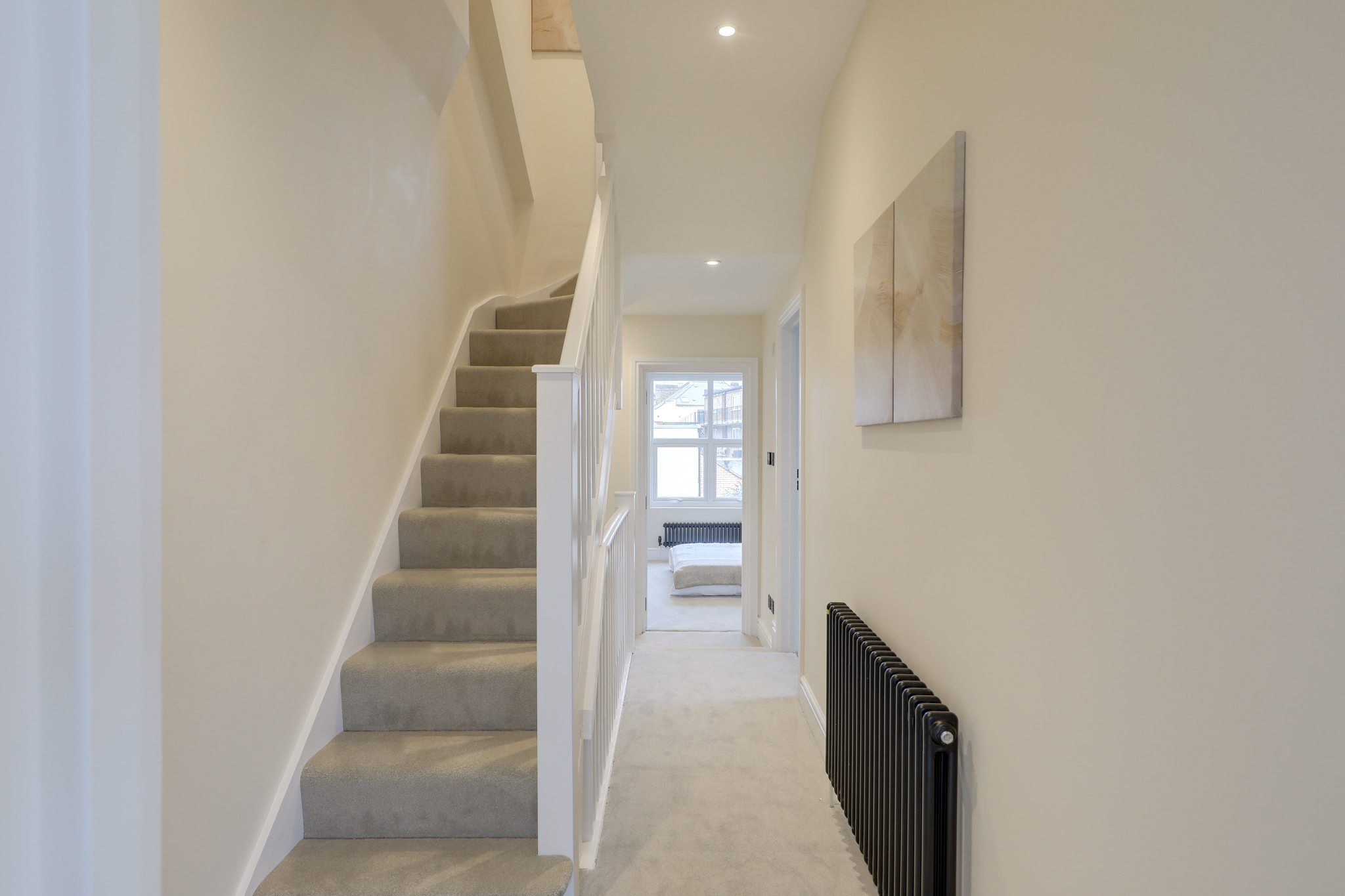 Spotlights, bay window, radiators, alcove space, wood floor.
