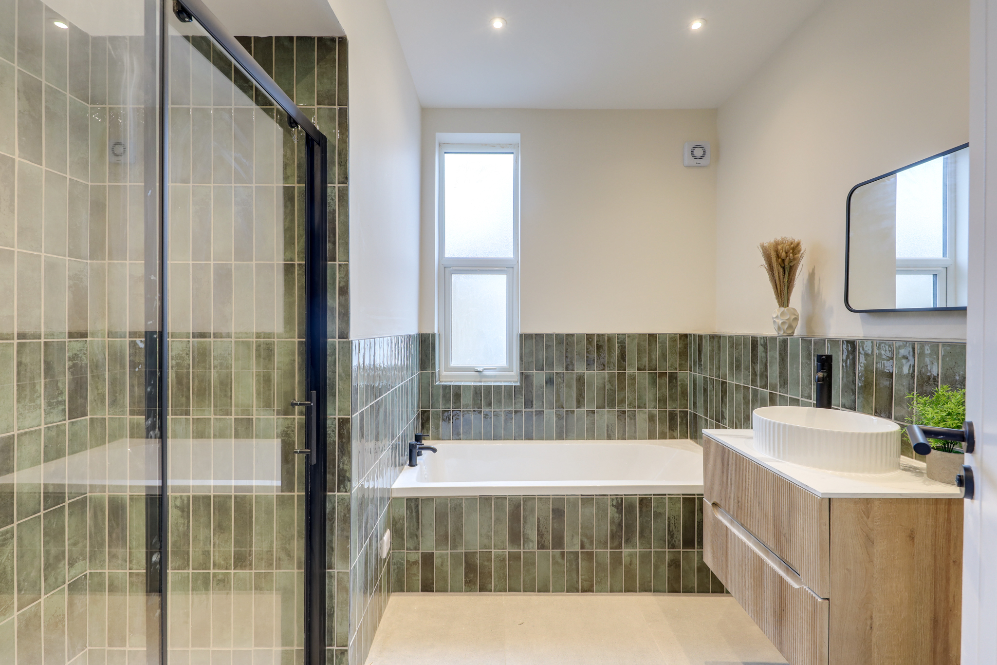 Spotlights, window, half tiled walls, fitted bath tub, wall-mounted unit with sink basin and mixer tap, toilet, walk-in shower with mounted shower head, tile floor.