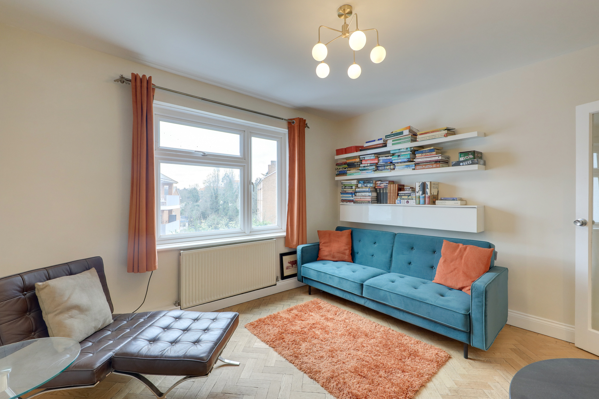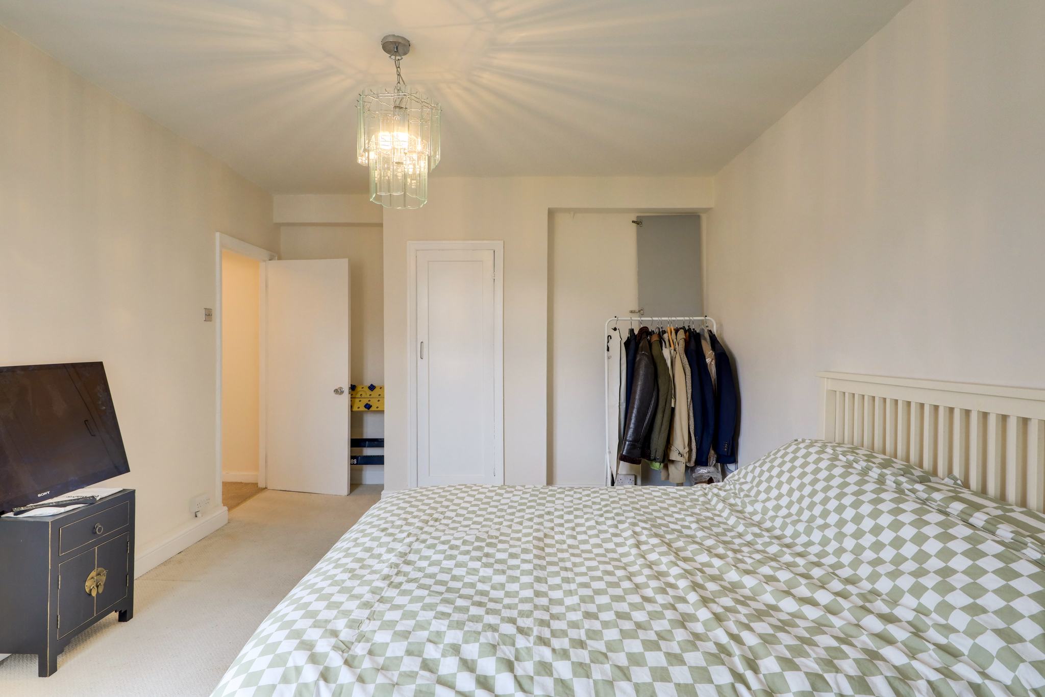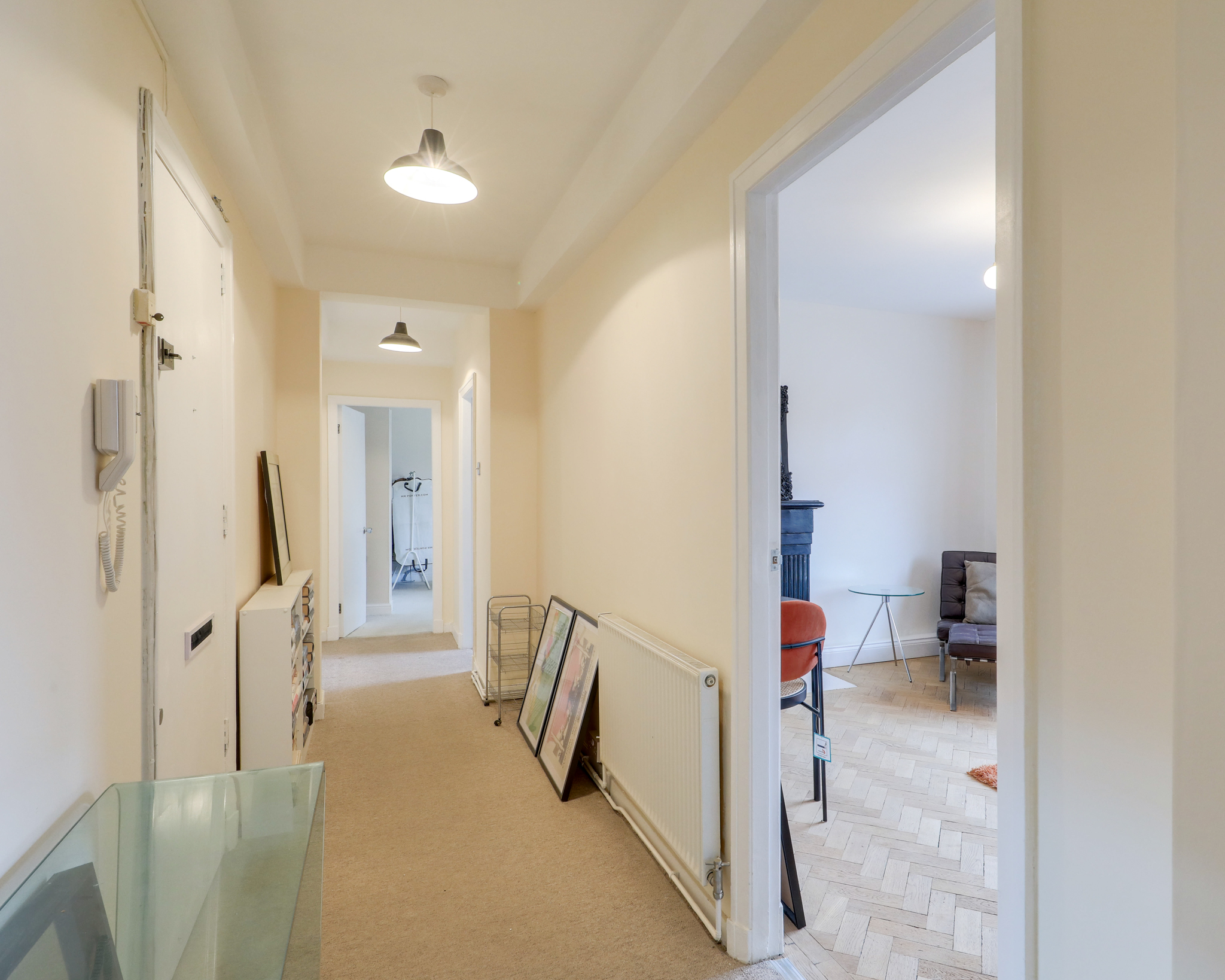 Pendant ceiling lights, radiator, fitted carpet.