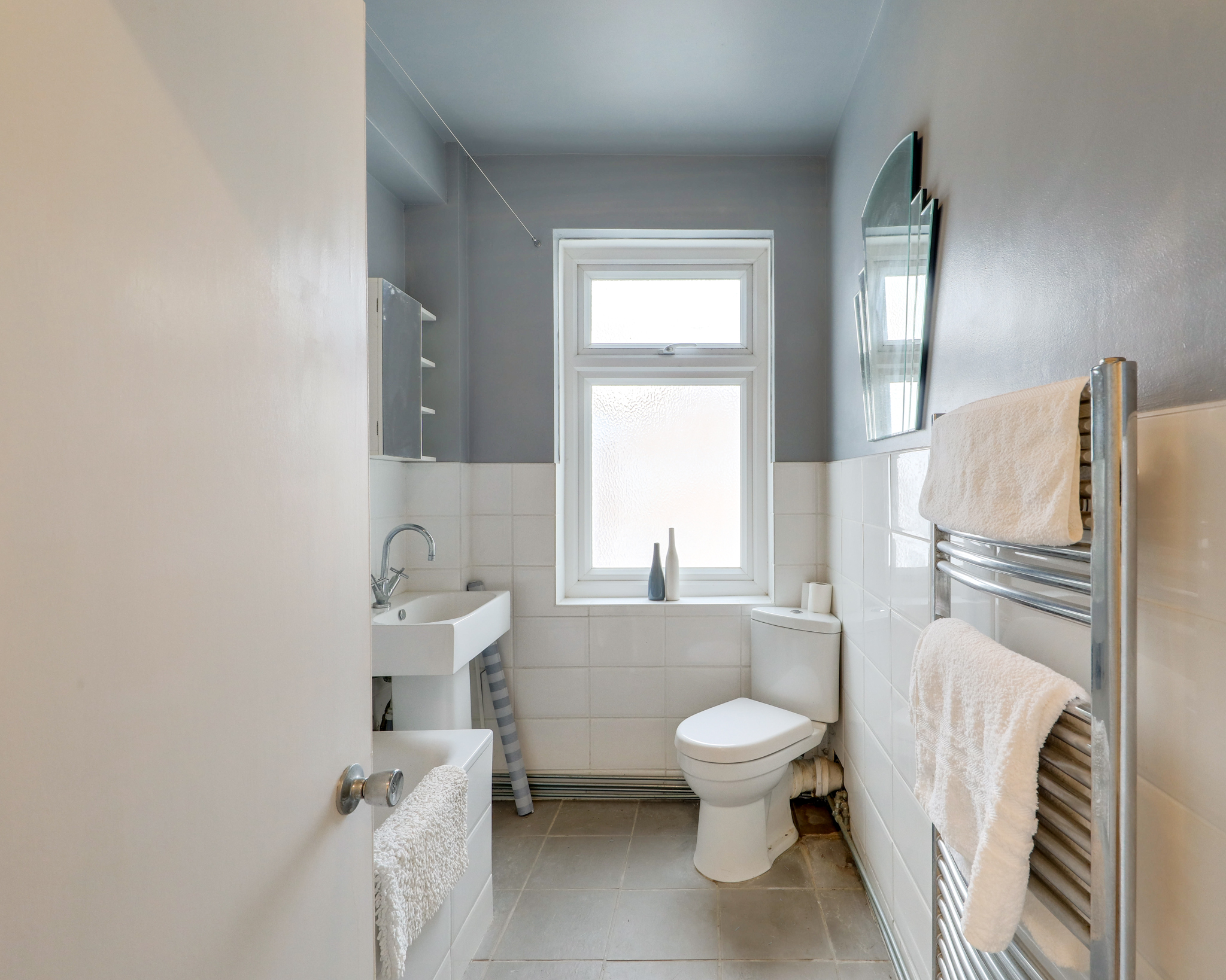 Double-glazed window, ceiling light, bathtub with shower, washbasin, WC, heated towel rail, tile flooring.