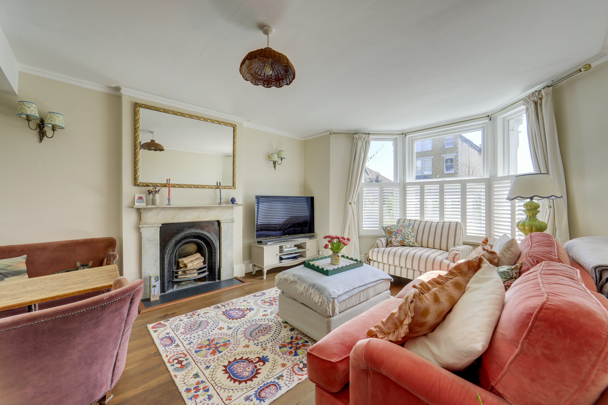 This elegant one-bedroom flat offers a perfect blend of period charm and contemporary living. The spacious reception room is a true highlight, featuring a beautiful bay window that fills the space with natural light and a striking period fireplace as its central focal point. Rich wood and hardwood flooring run throughout, adding warmth and sophistication, while tasteful decorative elements - including a large mirror and classic furnishings - create a welcoming atmosphere ideal for both relaxing and entertaining. The generously sized bedroom boasts elegant wood flooring, a classic iron bed frame, and ample built-in storage with sleek white cabinetry, ensuring both comfort and practicality. The property’s hallway is equally impressive, with extensive built-in storage, decorative lighting, and a functional desk area, leading to the heart of the home.