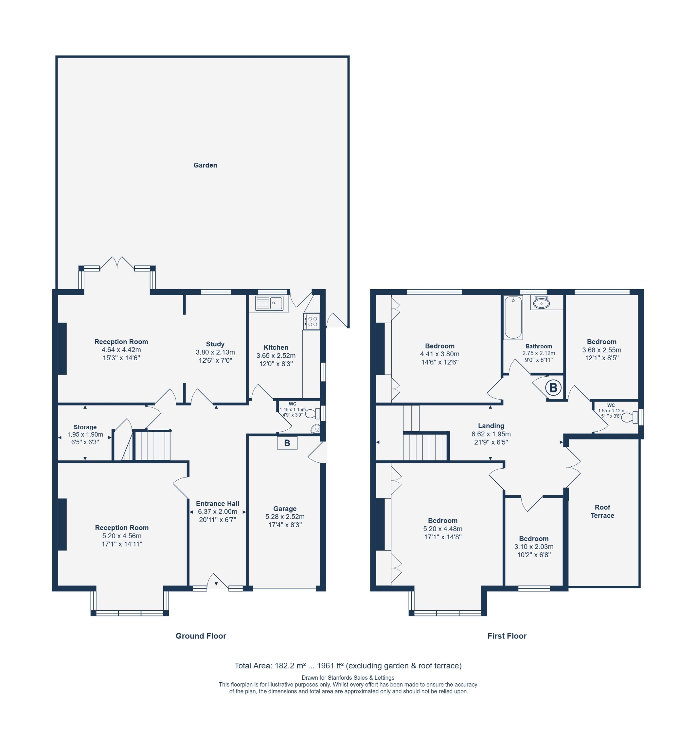 Upstairs, the first-floor landing is beautifully illuminated by French doors opening onto a roof terrace. There are four bedrooms—two of which are generous doubles with built-in wardrobes—alongside a family bathroom and separate WC. Additional benefits include a garage and loft, both providing excellent storage and potential for conversion or extension (STPP).